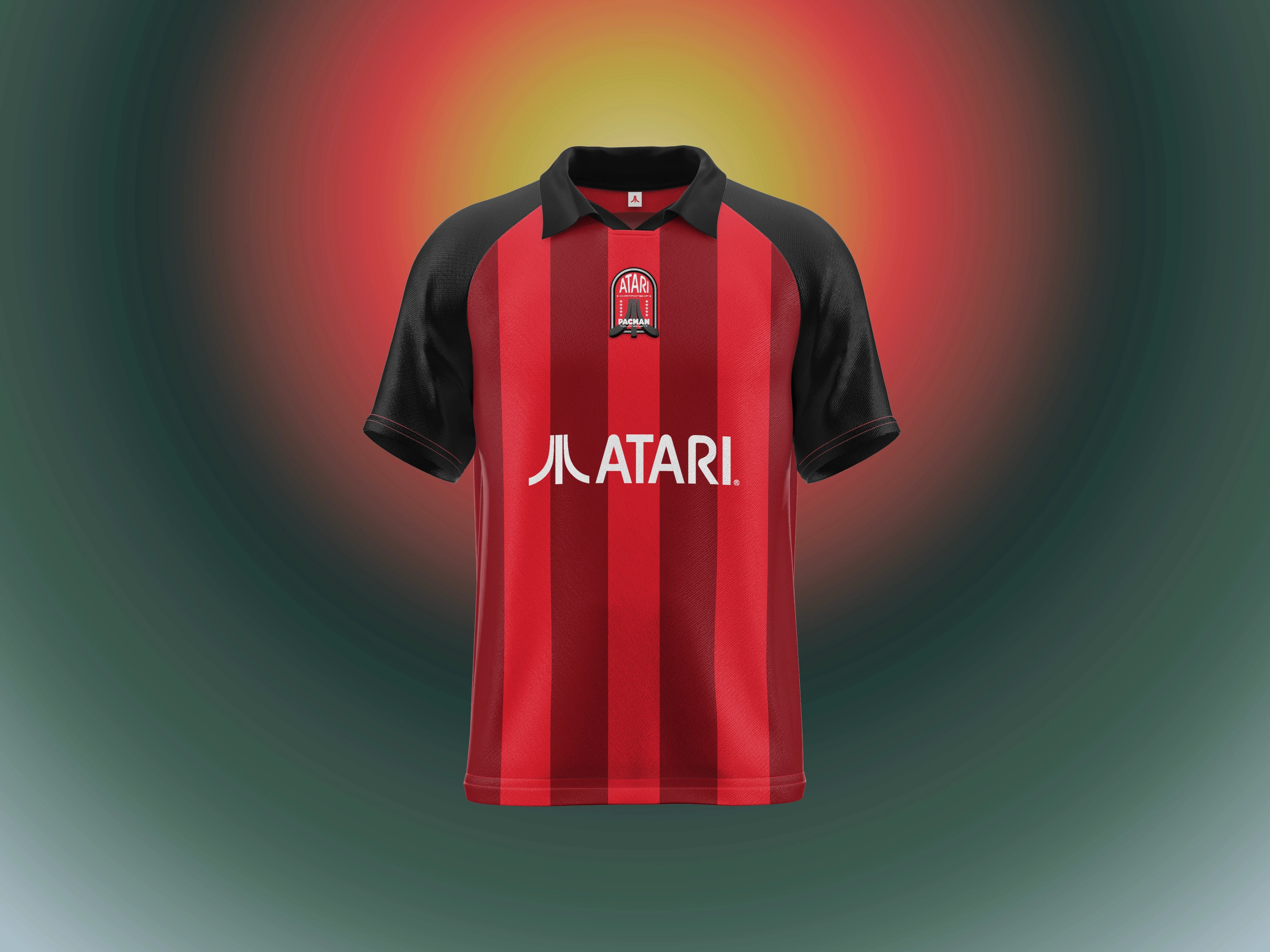 To extend the tournament identity into competitive gameplay, I created home and away jersey concepts that merge esports styling with traditional football kit structure. These uniforms feature, vertical striping derived from Atari brand geometry, a centralized crest placement for team identity recognition, and high-contrast numbering optimized for spectatorship